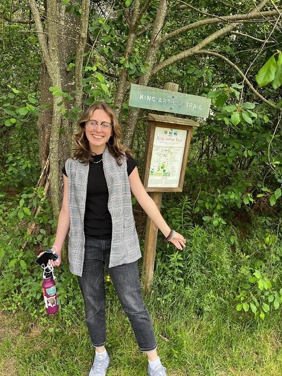 Addison poses in front of the King Arthur Trail sign.