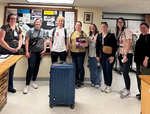 Research team stands gathered in the MPM anthropology department around their equipment suitcase.