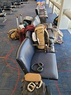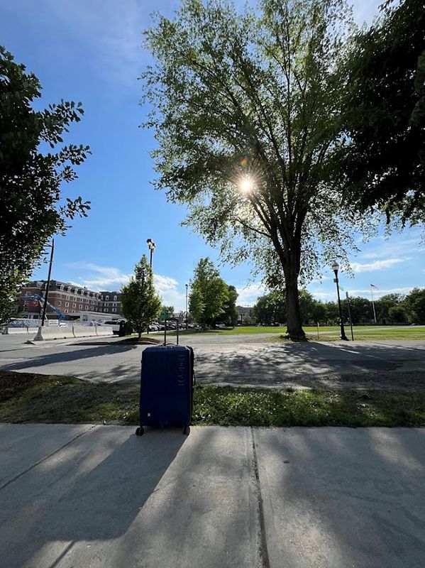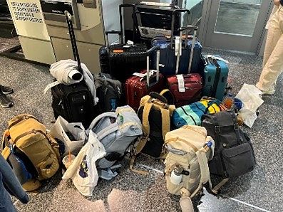 Lab team gathered waiting for Dartmouth Coach to arrive, our total luggage pile, and on the Dartmouth Coach driving through Boston.