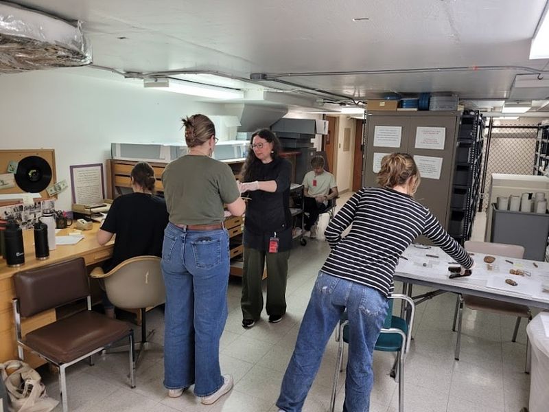 Medeia examining an item while Lily looks on, Lisa searches the museum’s collection, and Addison takes 2D photos of items.