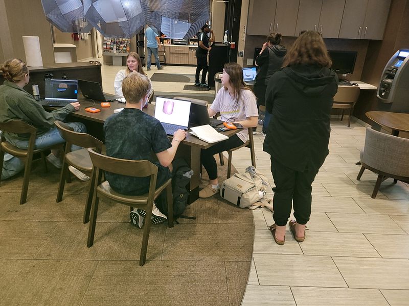 The research team processing data and drafting models in the hotel’s lobby.