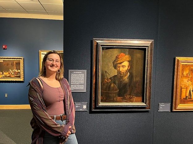 Peyton posing with a portrait titled “The Geographer” by Willem Drost, an apprentice to Rembrandt.
