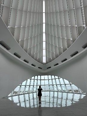 Lily enjoying the interior of Milwaukee Art Museum's "Burke Brise Soleil", or "The Wings".