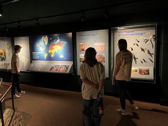 Brennan, Addison, and Abby touring a museum exhibit.