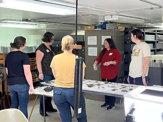 Research team stands gathered around artifact table while Lisa explains the use of an item.