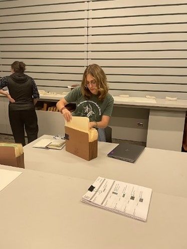 Addison collecting information on items from the Hood Museum’s archives.