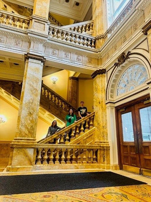 Addison, Abby, and Brennan posing on a staircase in the Milwaukee Public Library entrance atrium.